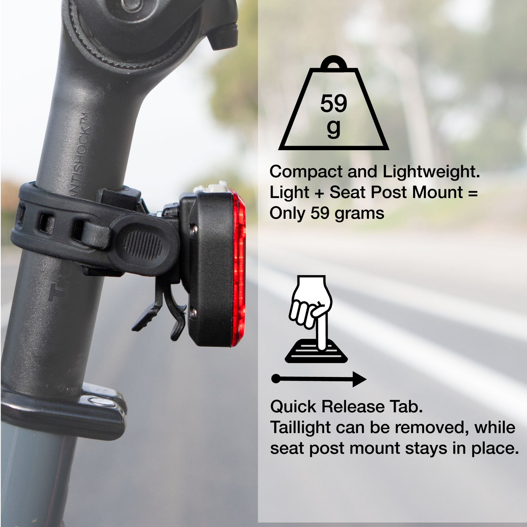 This compact and lightweight bike taillight is perfect for road cyclists, commuters, and urban riders. With 7 versatile modes, including flash, pulse, and steady options; it delivers up to 24 hours of runtime (low steady mode) and features mode memory, so it powers on in the last mode used.